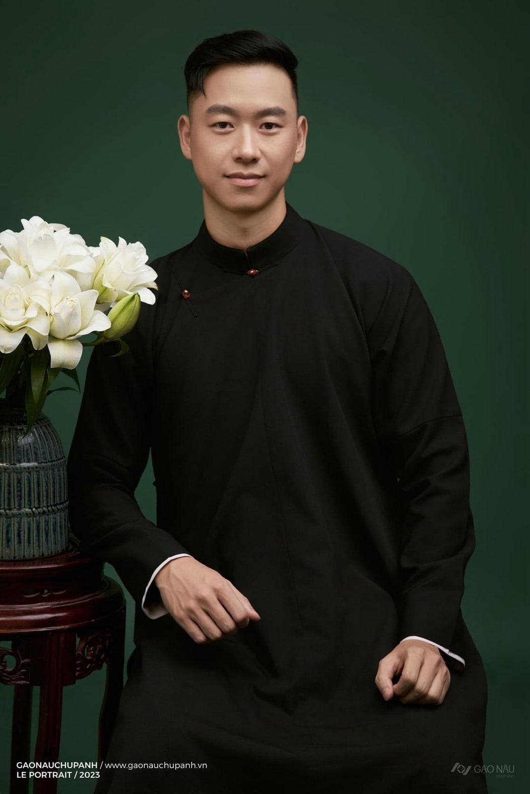 Đàn ông Việt khoác áo dài là một chuyện khác. Chiếc áo dài nam cách tân đen trơn, cổ đứng cao, khuy tết màu đỏ nhỏ làm điểm nhấn, tay áo dài ôm vừa vặn, cổ tay điểm nẹp trắng; người mẫu tựa bên chiếc đôn gỗ cổ chạm khắc, trên đôn đặt bình gốm xanh cắm hoa loa kèn trắng đang chớm nở. Phông nền xanh rêu trầm — sắc xanh của rừng già, của thời gian — tôn lên chất vải đen tuyền. Nụ cười mỉm nhẹ, ánh nhìn thẳng, dáng đứng vững chãi nhưng không cứng. Concept này phù hợp với nam giới muốn chụp chân dung mừng tuổi bố, mừng thọ, chụp đôi với vợ, chụp gia đình ngày Tết, hoặc đơn giản là muốn lưu lại một khoảnh khắc mình mặc quốc phục. Hợp cả với các chàng trai trẻ, các anh trung niên, các bác đã có tuổi — áo dài nam vốn là trang phục không kén tuổi, chỉ kén khí chất. Một bức ảnh đủ trang trọng để đóng khung treo trong phòng khách.