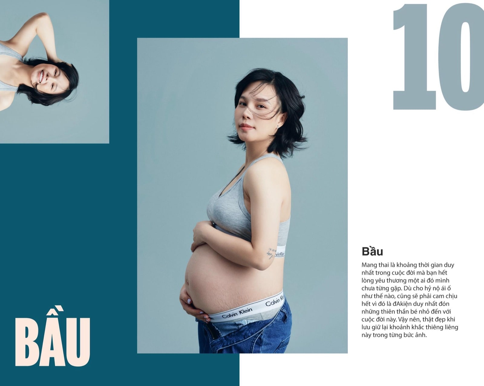 Làm mẹ không có nghĩa là thôi làm chính mình. Chiếc bra thể thao xám ghi, quần jeans xanh để hạ cạp lộ bụng tròn, tóc ngắn bồng tự nhiên — toàn bộ concept toát ra năng lượng trẻ trung, thành thị, đầy sức sống. Phông nền xanh teal sâu tương phản với tông da ấm, những bố cục khung lồng trong khung, số trang lớn in góc ảnh — tất cả làm nên bộ ảnh mang tinh thần editorial magazine, không phải studio bầu thông thường. Nụ cười bật ra từ bên trong, không cần hoa, không cần voan lụa. Concept Bầu Sport phù hợp với các mẹ trẻ tính cách thẳng thắn, yêu thể thao, yêu sự năng động, không thích sự điệu đà truyền thống. Cũng là lựa chọn tuyệt vời cho những mẹ muốn chụp một bộ khác biệt làm tư liệu truyền thông cá nhân, hoặc đơn giản là muốn khoe rằng bầu bí vẫn đẹp theo cách của riêng mình. Bầu không phải là giai đoạn phải ẩn đi, mà là giai đoạn đáng được giới thiệu.