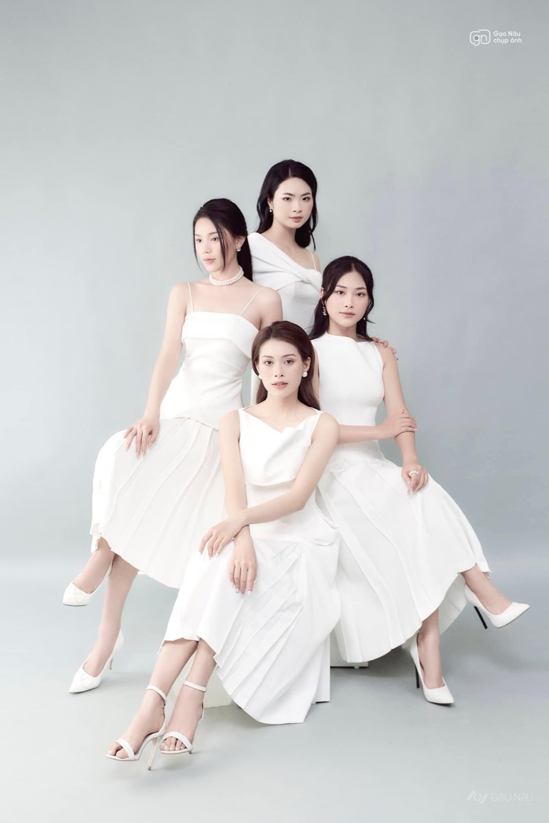 Có những tình bạn đáng được chụp như ảnh bìa tạp chí. Bốn cô gái, bốn chiếc đầm trắng kiểu dáng khác nhau — cổ vuông, cổ yếm, dây mảnh, nơ vắt vai — nhưng cùng một tông trắng ngà tạo thành khối thống nhất. Một người ngồi phía trước chân vắt chéo, ba người phía sau đứng ngồi xen kẽ tạo chiều sâu bố cục kim tự tháp. Phông xám bạc có gradient nhẹ từ sáng sang tối làm nổi các đường viền váy; đôi giày cao gót trắng, ngọc trai, khuyên tai nhỏ — phụ kiện tiết chế để trang phục được dẫn dắt. Không ai cười toét, không ai nheo mắt — thần thái cứ thế mà có. Phù hợp với hội bạn thân muốn kỷ niệm sinh nhật, tốt nghiệp, hay chỉ đơn giản là đã đi qua nhau một chặng dài và thấy cần lưu lại. Bạn cũ, váy mới, một buổi chiều trong studio — đôi khi, kỷ niệm cần đúng một khung ảnh để neo lại.