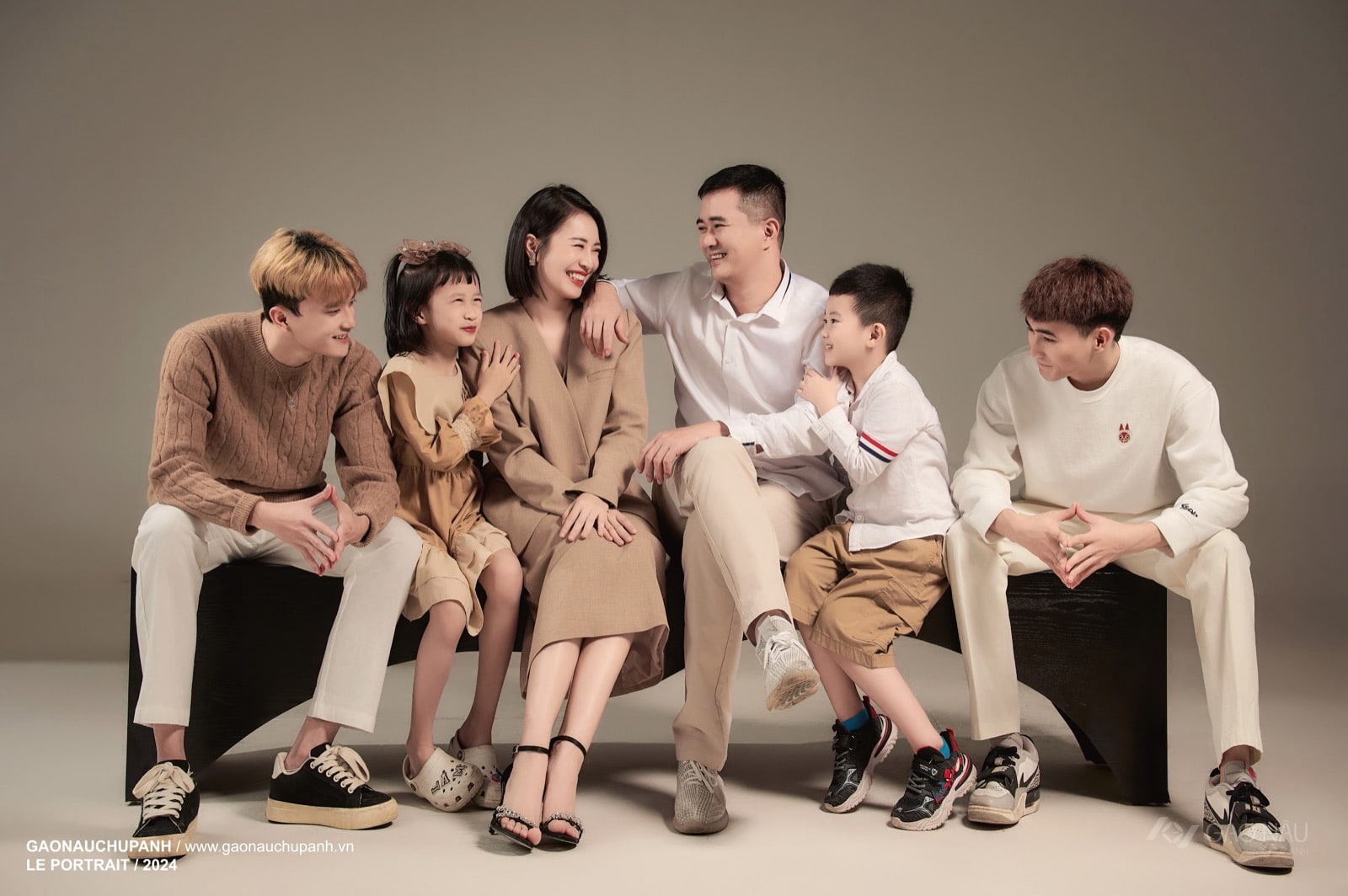 Có những gia đình đông con, khi ngồi lại cùng nhau đã thành một khung cảnh đẹp. Trong khung hình ngang, sáu người ngồi trên dãy ghế đen thấp — ba mẹ ngồi giữa, hai bên là các con từ bé đến lớn. Trang phục phối gam kem, be, nâu cà phê, trắng — đồng điệu mà không đồng phục. Mẹ mặc đầm nâu dài, ba sơ mi trắng tay dài; các con có em gái áo nâu nhạt, em trai áo trắng sọc, anh lớn áo len cáp nâu, cậu út áo trắng kem. Ai cũng nghiêng sang nhìn nhau cười — một khung hình ngang đầy những ánh mắt đan chéo, như một bàn tiệc cười vừa bắt đầu. Phù hợp với gia đình đông thành viên — bốn con trở lên — muốn một bức ảnh không chia khung, không đứng cứng. Phù hợp với gia đình có con ở nhiều lứa tuổi khác nhau. Khi treo lên tường, ai bước vào cũng đứng lại đếm — rồi mỉm cười, nhà mình cũng muốn có một bức như vậy.