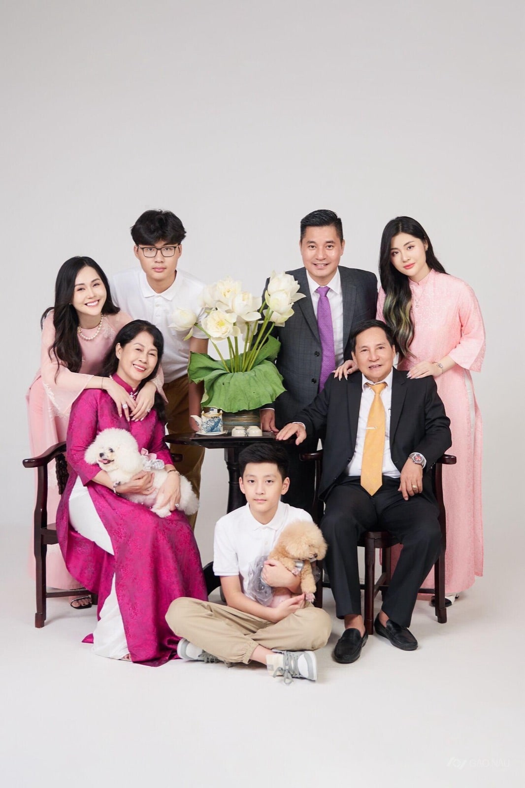 Có những gia đình, chỉ cần một bình sen trắng ở giữa là đủ để nói về gốc rễ. Trong khung hình, bảy người xếp thành bố cục ba tầng — ông bà ngồi phía trước trên ghế gỗ, ông trong vest đen cravat vàng, bà trong áo dài hồng sen ôm chú poodle trắng. Đứng phía sau là ba, mẹ, con gái lớn đều mặc áo dài và vest hồng pastel, một cậu con trai áo polo trắng. Ở dưới cùng, cậu út ngồi bệt trên sàn ôm chú poodle nâu nhỏ. Giữa khung là một bàn gỗ tròn đặt bình sen trắng đang nở — loài hoa báo hiệu một gia đình gốc Á. Nền trắng sạch làm nổi từng tấm áo hồng. Phù hợp với gia đình ba thế hệ muốn chụp ảnh cho dịp đại thọ, Tết, hoặc kỷ niệm cưới vàng của ông bà. Phù hợp cả với gia đình có thú cưng — khi các em chó được xem như một thành viên thật sự. Bức ảnh ấy treo phòng khách, là cả một cây gia phả chưa cần nói thành lời.
