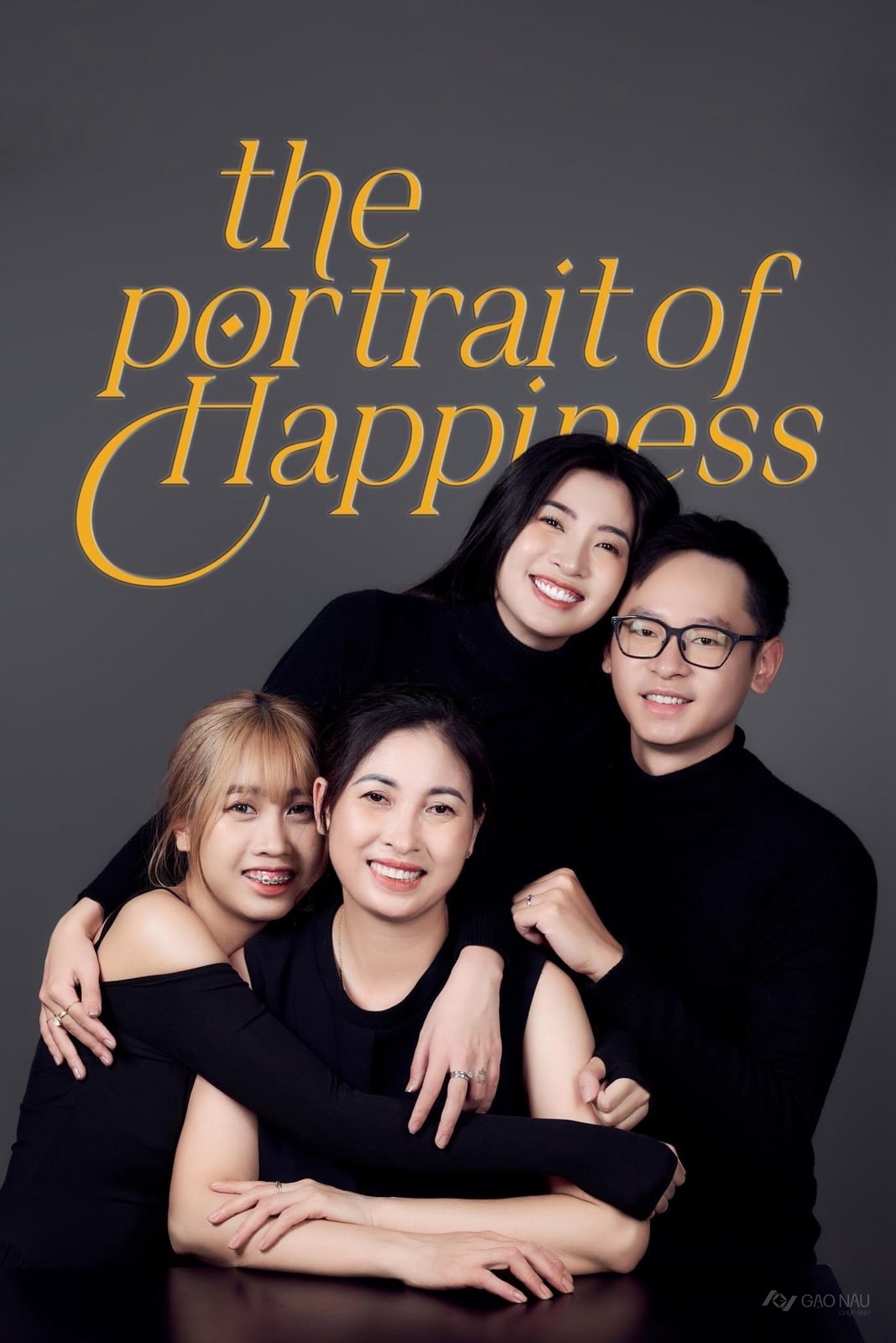 Hạnh phúc gia đình đôi khi chỉ cần bốn người mặc cùng một gam đen, và một cái ôm. Trong khung hình đứng, dòng chữ vàng 'the portrait of Happiness' viết tay phủ nửa trên bức ảnh như một tiêu đề tạp chí. Phía dưới, mẹ ngồi giữa trong áo đen, hai cánh tay choàng ôm con gái út và chồng; con gái lớn đứng phía sau tay đặt lên vai em trai; tất cả cùng mặc áo đen cổ cao, nổi bật trên nền xám gradient. Mỗi người một kiểu tóc, một nét cười — nhưng bố cục hình tứ giác khép kín khiến cả bốn trở thành một khối gắn kết. Phù hợp với gia đình bốn người có con đã trưởng thành — khoảng tuổi teen đến hai mươi — muốn một bức ảnh kinh điển treo phòng khách. Phù hợp với gia đình muốn tặng nhau một món quà Tết không phải bằng tiền. Bức ảnh treo lên, không ai hỏi chụp ở đâu — chỉ hỏi bao giờ gia đình mình cũng chụp được như thế.