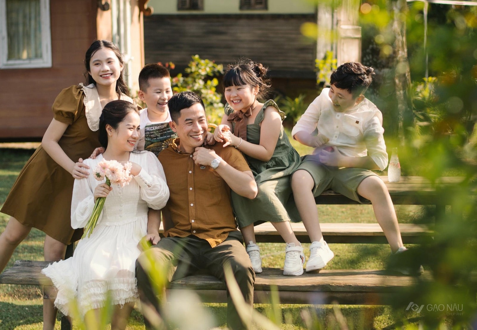 Có những buổi chiều, cả gia đình chỉ ngồi cạnh nhau mà cười cũng đã thành ảnh. Trong khung hình ngoài trời, sáu người ngồi trên bậc gỗ trước mái nhà gỗ màu nâu — ba mẹ ở giữa, bé trai áo xám ngồi lên đùi mẹ, bé gái áo xanh rêu tựa vào lưng ba, chị lớn áo be ôm vai mẹ, cậu út áo trắng ngồi phía cuối. Nắng chiều xuyên qua tán cây làm đổ vệt vàng mềm lên mọi gương mặt. Trên tay mẹ là một bó hoa nhỏ. Tất cả đều cười — không ai tạo dáng, chỉ là một phút đùa vui đúng lúc máy bấm. Phù hợp với gia đình đông thành viên muốn thoát khỏi phòng chụp, muốn một buổi ảnh có cỏ cây, có gió. Phù hợp với gia đình có con nhỏ, nơi bọn trẻ không chịu đứng im trong studio. Phù hợp với gia đình ba thế hệ đi chơi cuối tuần. Khi treo bức ảnh lên phòng khách, cái nắng chiều ấy sẽ còn mãi — ngay cả khi ngoài trời đang đổ mưa.