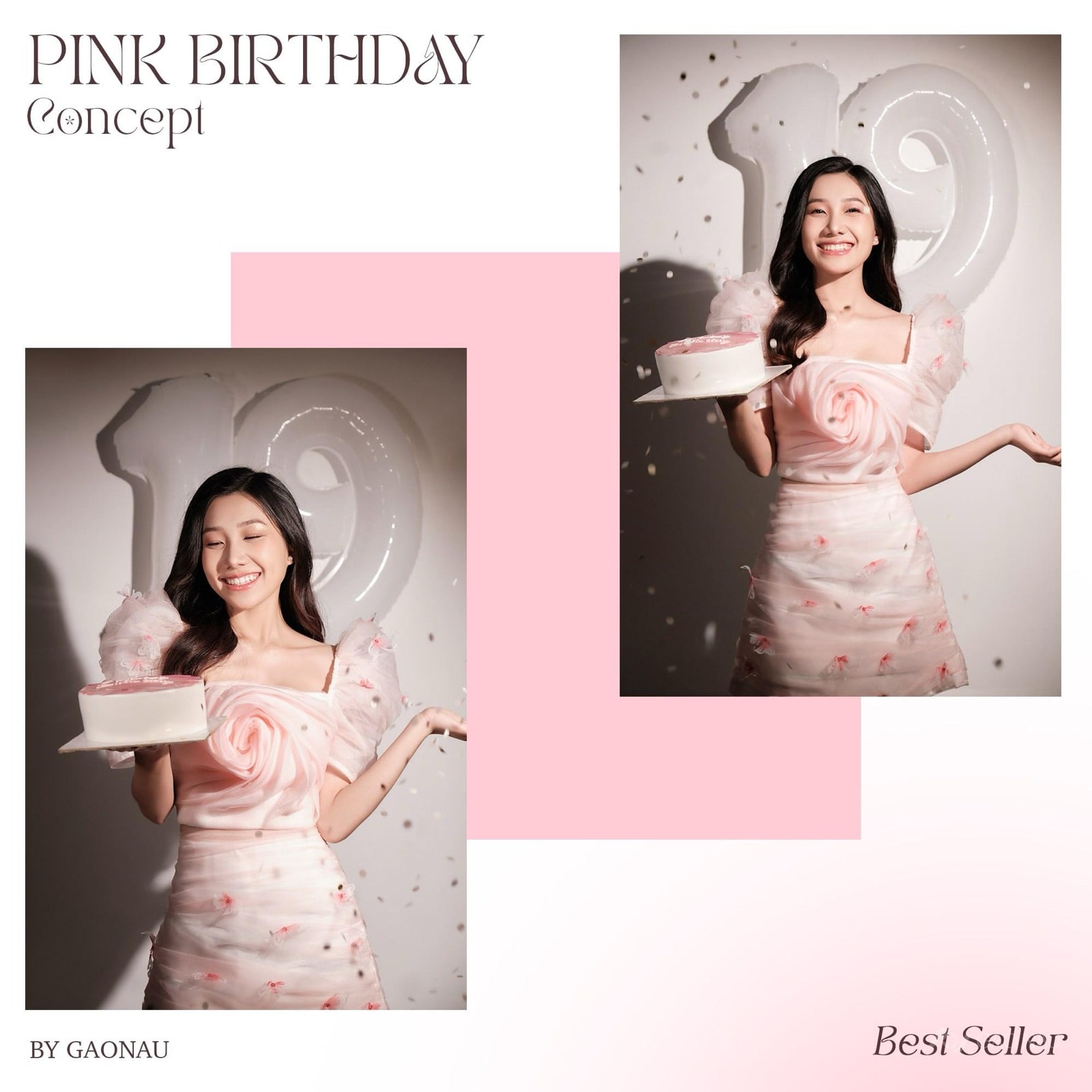 Tuổi trẻ có một màu rất riêng, và ở Gạo Nâu, màu ấy thường là hồng. Chiếc váy voan hồng phấn với bông hồng to gợn trên ngực, tay áo phồng nhẹ như cánh bướm; một tay nâng chiếc bánh kem, tay kia mở ra đón những mẩu confetti đang rơi lả tả. Phía sau, bóng số màu bạc ánh lên dưới nắng studio — một con số đánh dấu năm mới của đời mình. Nụ cười bật ra rất thật, không cần đạo diễn. Concept này là best-seller của studio cho các bạn nữ mười tám, mười chín, đôi mươi — lứa tuổi mà mỗi tuổi mới đều xứng đáng có một bộ ảnh để khoe, để lưu, để mấy năm sau mở lại vẫn thấy mình đang cười. Phù hợp với các bạn yêu tông ngọt, thích phong cách công chúa hiện đại, muốn ảnh đẹp đăng sinh nhật mà không cần chỉnh quá tay. Một năm chỉ có một lần — tại sao không dành cho mình một buổi chụp tử tế.