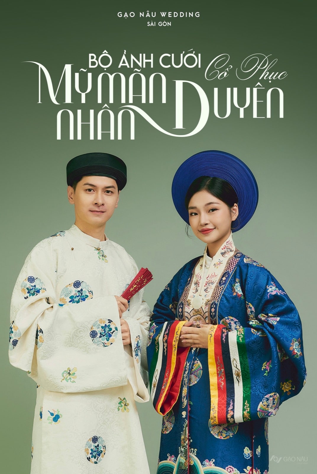 Có những mối duyên được gọi bằng đúng hai chữ mỹ mãn. Chàng áo tấc trắng ngà, thân áo thêu hoa văn gấm xanh chen lá, đội mấn đen, tay cầm quạt đỏ. Nàng Nhật Bình xanh lam điểm hoạ tiết phượng và mây, giao lĩnh nhiều dải màu thất thể buông trước bụng, đội mấn xanh ngọc. Phông xanh rêu lá, chữ thư pháp Bộ Ảnh Cưới Mỹ Mãn Nhân Duyên Cổ Phục điểm ở phía trên. Ánh sáng studio sang trọng, đường viền sắc nét như tranh cung đình. Phù hợp với những cặp đôi muốn có một bộ ảnh cưới cổ phục chuẩn chỉnh về mặt trang phục và lễ nghi, dành cho người yêu văn hoá Việt ở mức độ chuyên sâu. Thích hợp cho ảnh cưới, kỷ niệm, hoặc dịp đặc biệt như ra mắt dòng họ. Một bộ ảnh để con cháu sau này nhìn vào, tự hào rằng ngày ông bà thành hôn đã chọn giữ lại vẻ đẹp của tổ tiên.