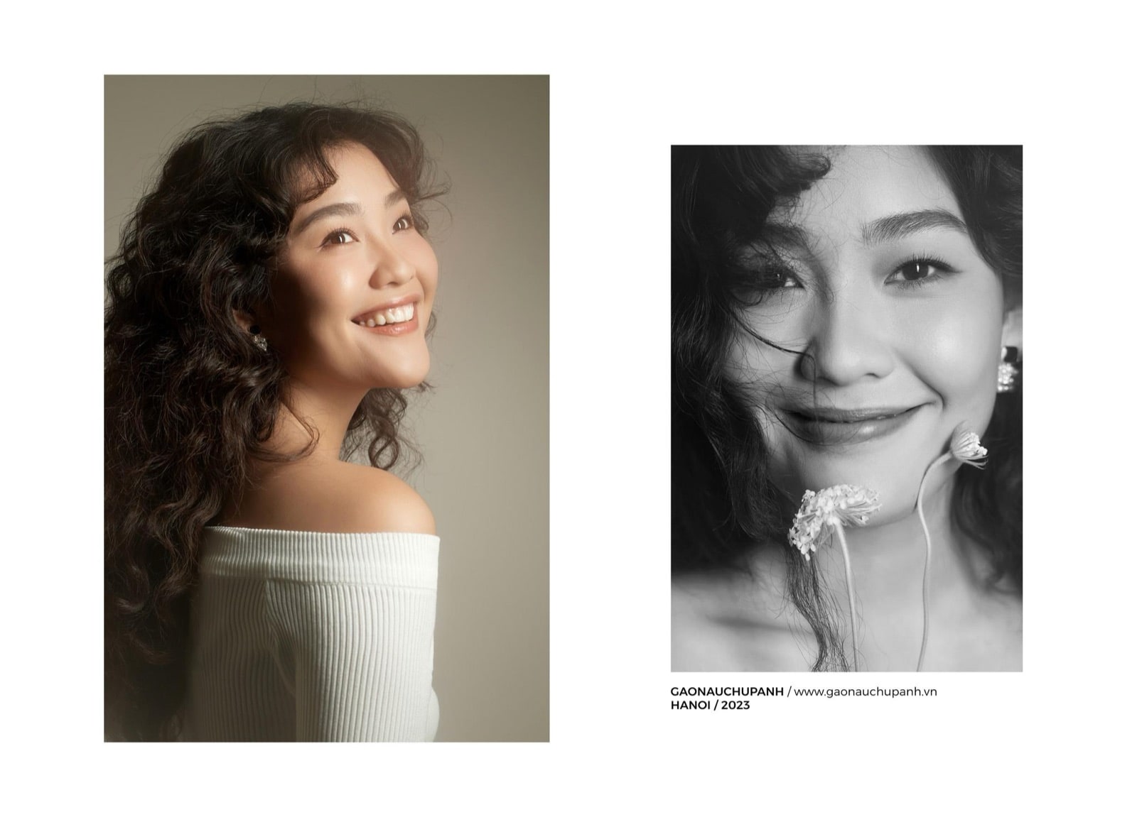 Tóc xoăn dài, áo trễ vai trắng, cười giòn. Hai khung diptych — một màu ấm, một đen trắng điện ảnh.