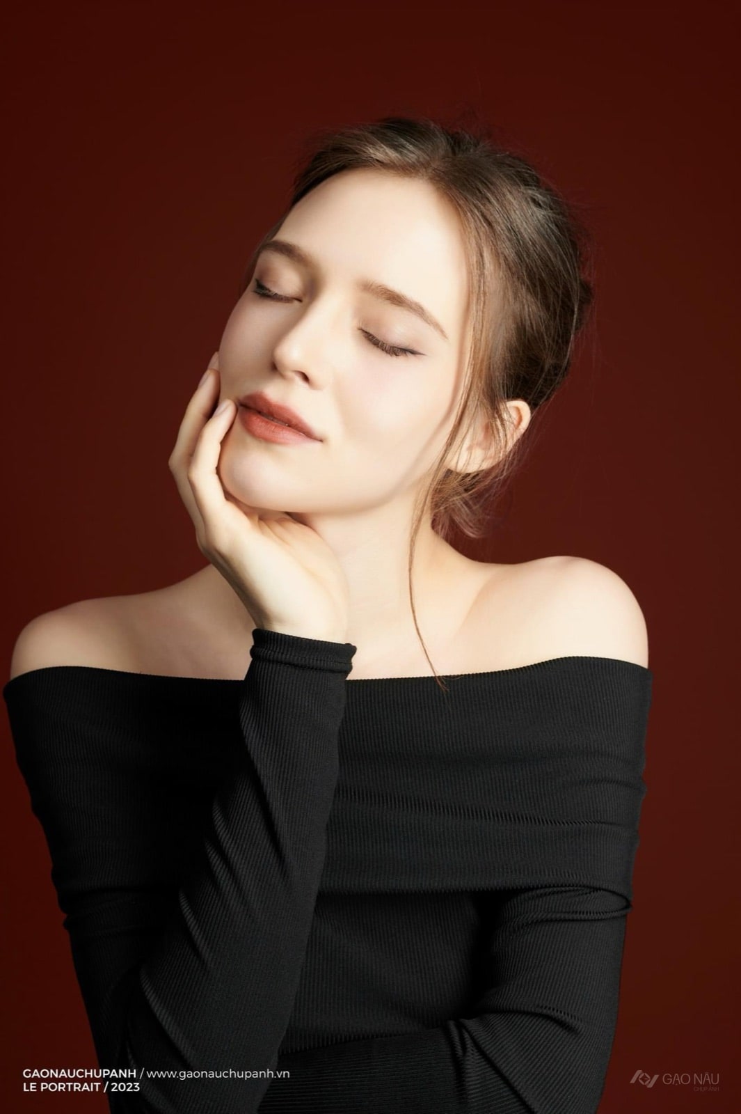 Nền đỏ rượu vang, áo trễ vai đen, nhắm mắt chạm tay lên cằm. Chân dung mơ màng, tone ấm cổ điển.