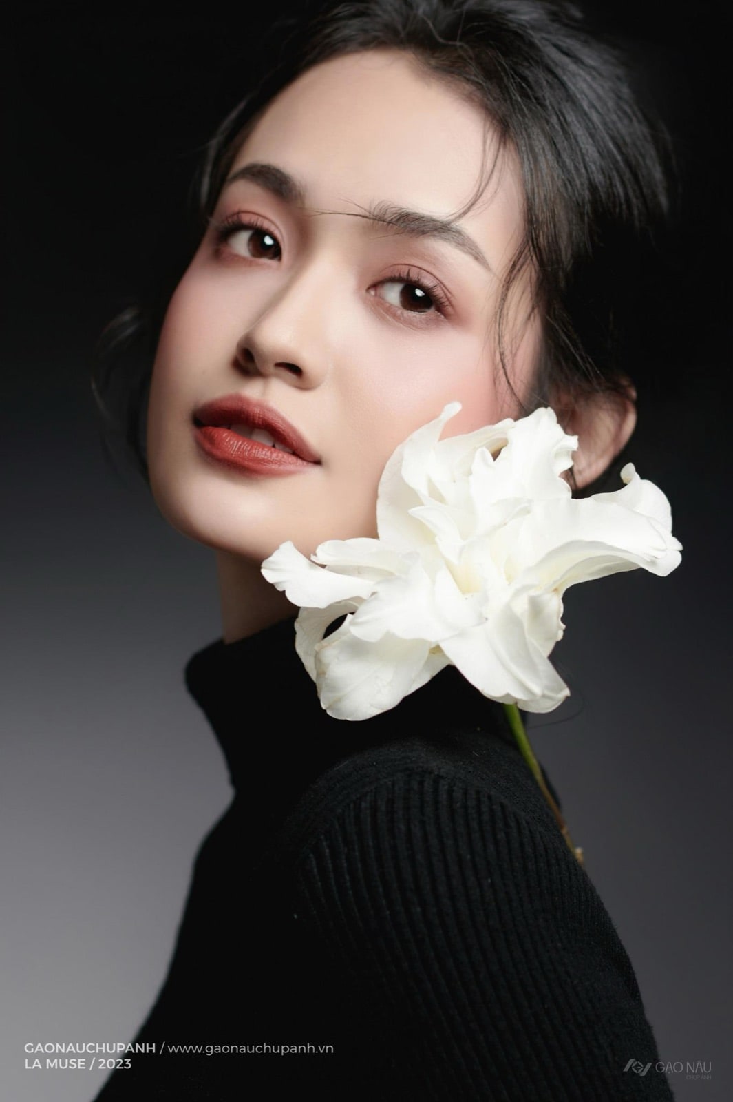 Nền đen sâu, áo lụa ngà, tay cầm cúc đỏ đưa lên cằm. Chân dung tĩnh, tone điện ảnh Á Đông.