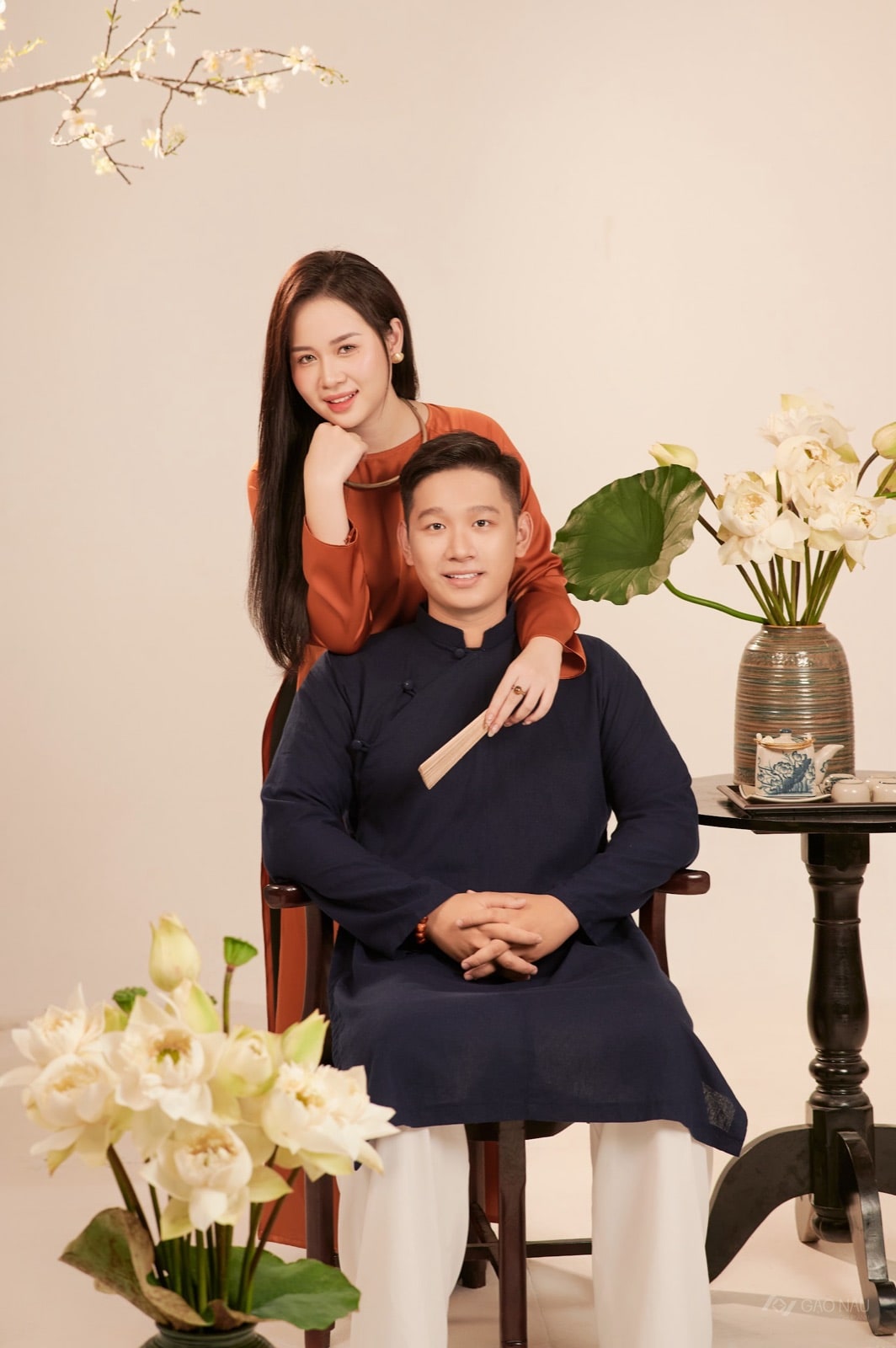 Couple áo dài truyền thống, nàng cam đất anh xanh than, ấm trà gốm và sen trắng bên cạnh, tình yêu thanh nhã kiểu cũ.