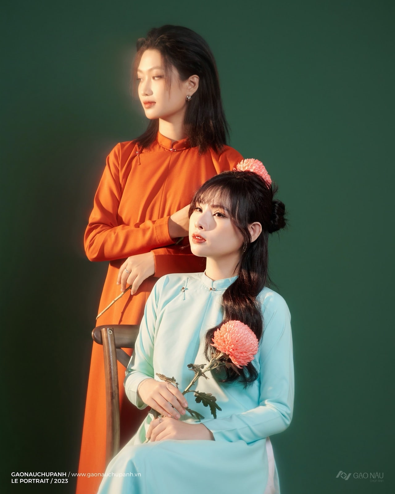 Đôi áo dài trước phông xanh rêu, một cam một xanh ngọc, hoa cúc pha lê cài tóc, chất Á Đông hiện đại.